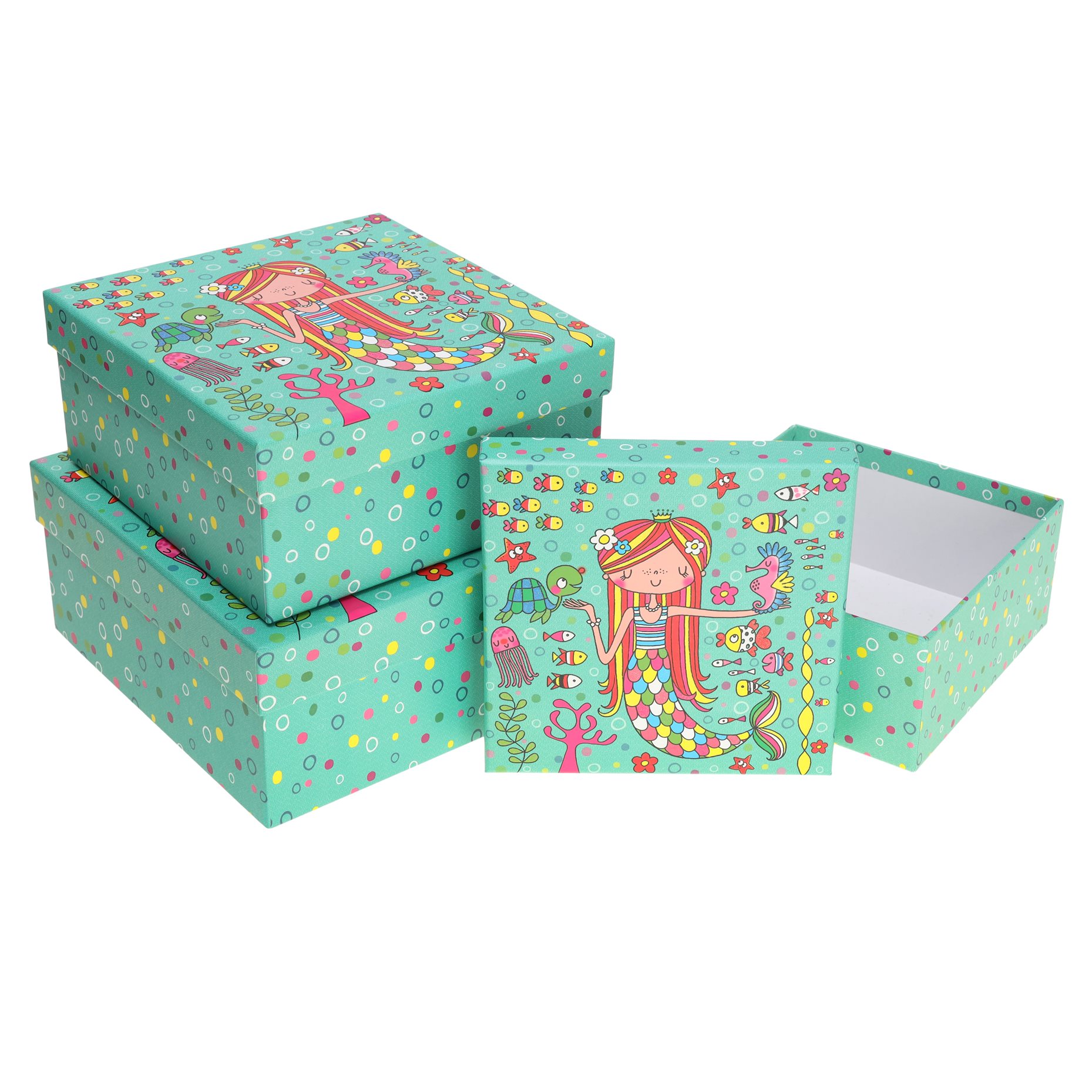 Opis produktuZasady bezpieczeństwaZestaw pudełek prezentowych kwadratowych 3szt, motyw morski z syreną Wymiary pudełek: