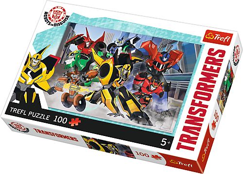 Puzzle 100 elementów z Transformersami. Po ułożeniu powstanie obrazek o wymiarach 41x27,8 cm. Wysoką jakość, nasycenie kolorów i bezpieczeństwo układania zapewnia kalandrowany papier odbijający światło i wykorzystanie materiałów ekologicznych.