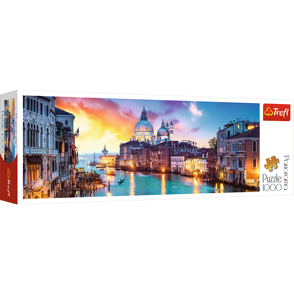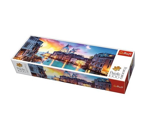 Panoramiczne puzzle 1000-elementowe ze zdjęciem przedstawiającym wenecki Canal Grande. Po ułożeniu powstanie obrazek o wymiarach 97x34 cm. Wysoką jakość, nasycenie kolorów i bezpieczeństwo układania zapewnia kalandrowany papier odbijający światło, pokryty ekologicznymi farbami spożywczymi. x