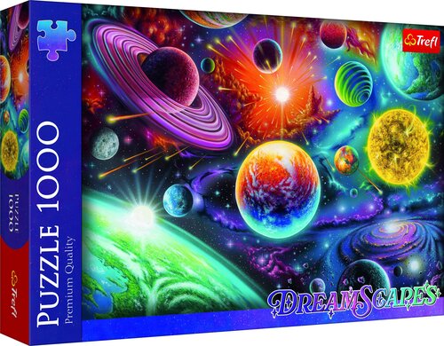 Puzzle DreamScapes: Kosmiczna przygoda, składające się z 1000 elementów, przedstawiają eksplodujący barwami wszechświat pełen planet, gwiazd i galaktyk. Po ich ułożeniu powstanie obrazek w rozmiarach 683x480 mm.