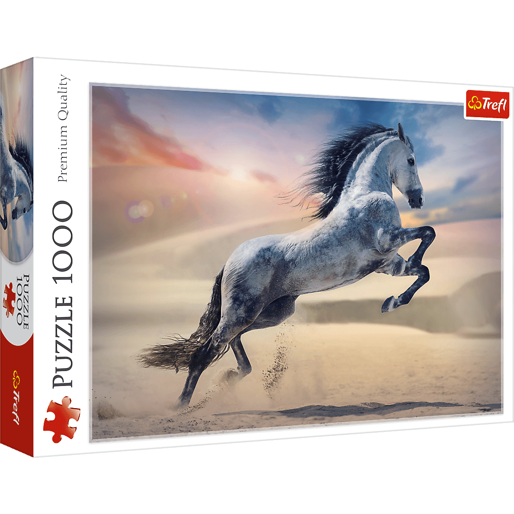 Puzzle Majestatyczny koń, składające się z 1000 elementów, przedstawiają biegnące po pustyni zwierzę, na tle zachodzącego słońca. Po ich ułożeniu powstanie obrazek o wymiarach 683x480 mm. Produkt został wykonany z wysokiej jakości materiałów, z zastosowaniem specjalnego kalandrowanego papieru odbijającego światło, co ułatwia układanie. Puzzle wyprodukowane w Polsce, z zastosowaniem ekologicznych materiałów. x