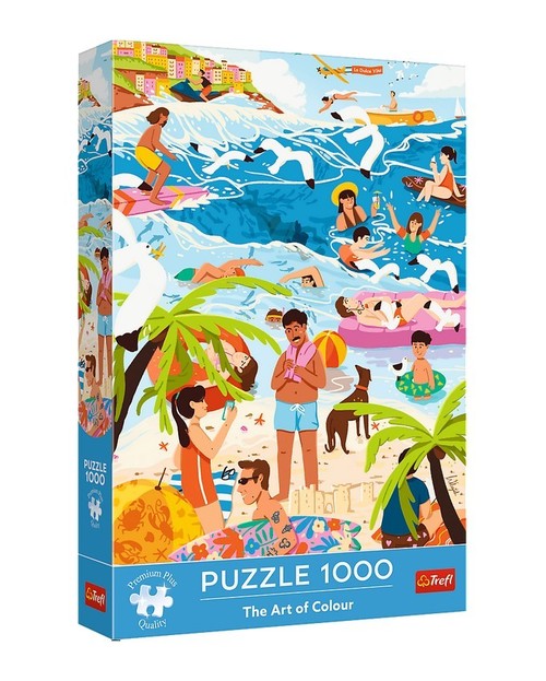 Puzzle W wakacyjnym ferworze, przedstawiają ludzi beztrosko spędzających wolny czas na plaży. Po ich ułożeniu powstanie obraz o wymiarach 683x480 mm.