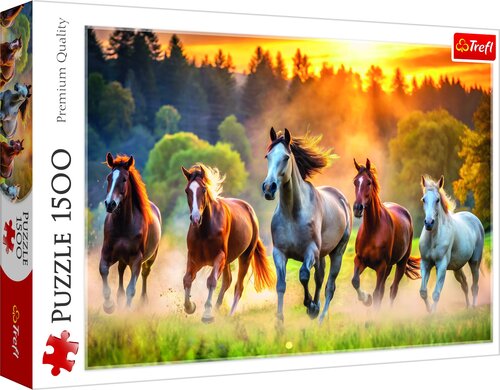 Puzzle Dzikie Konie składają się z 1500 elementów i przedstawiają piękne konie galopujące po zielonej trawie. Po ich ułożeniu powstanie obrazek o wymiarach 850x580 mm.