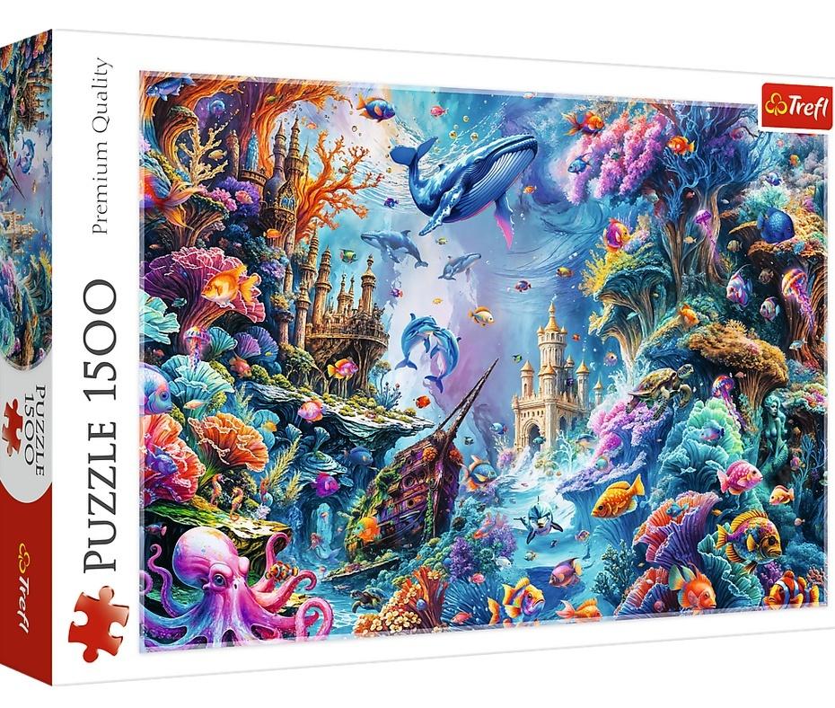 Puzzle Podwodny świat składają się z 1500 elementów i przedstawiają morskie środowisko z bujną roślinnością i wieloma podwodnymi zwierzętami. Po ich ułożeniu powstanie obrazek o wymiarach 850x580 mm.