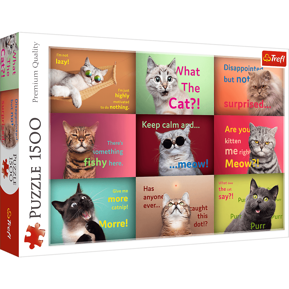 Puzzle Zabawne kocie portrety składają się z 1500 elementów i przedstawiają śmieszne memy z kotami w rolach głównych. Po ich ułożeniu powstanie obrazek o wymiarach 850x580 mm. Produkt został wykonany z wysokiej jakości materiałów, z zastosowaniem specjalnego kalandrowanego papieru odbijającego światło, co ułatwia układanie. Wyprodukowano go w Polsce, z dbałością o środowisko. x