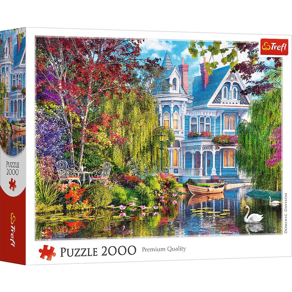Opis produktuZasady bezpieczeństwaPuzzle Dom nad jeziorem składające się z 2000 elementów przedstawiają malowniczą rezydencję położoną nad spokojnym jeziorem, otoczoną bujną zielenią, kolorowymi kwiatami i drzewami. Po ułożeniu powstanie obraz o wymiarach 961x682 mm. Produkt został wykonany w Polsce z wysokiej jakości materiałów. Zastosowanie specjalnego kalandrowanego papieru odbijającego światło sprawia, że układanie jest łatwiejsze. x