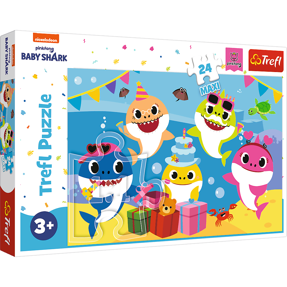 Wesołe Baby Shark to Puzzle 24 maxi składające się z 24 bardzo dużych elementów, zaprojektowaną z myślą o wszystkich fanach i fankach zwierząt morskich. Po ułożeniu układanki powstanie duży obrazek, o wymiarach 600x400mm. Produkt został wykonany z wysokiej jakości materiałów, z zastosowaniem specjalnego kalandrowanego papieru odbijającego światło, co ułatwia układanie. Produkt został wyprodukowany w Polsce, a do produkcji zostały użyte materiały ekologiczne.