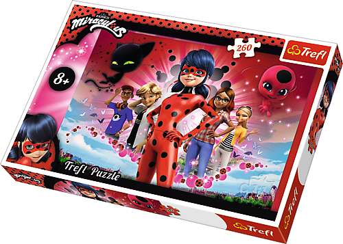 Puzzle 260 elementów z bohaterami filmu animowanego "Miraculous Ladybug". Po ułożeniu powstanie obrazek o wymiarach 60x40 cm. Wysoką jakość, nasycenie kolorów i bezpieczeństwo układania zapewnia kalandrowany papier odbijający światło i wykorzystanie materiałów ekologicznych.