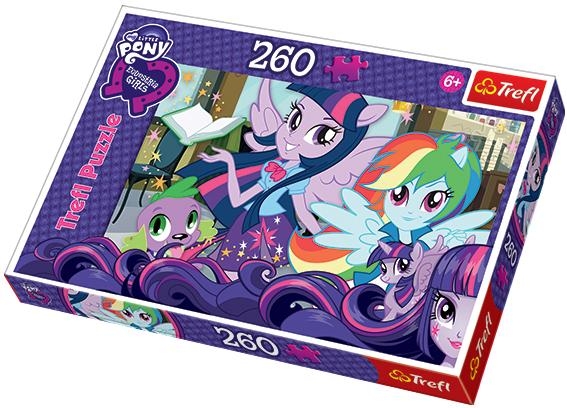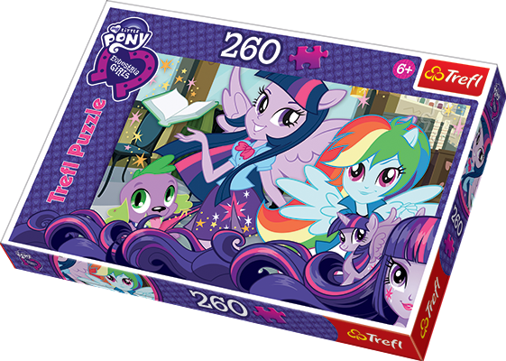 Puzzle 260 elementów z bohaterkami serialu "My Little Pony: Equestria Girls". Po ułożeniu powstanie obrazek o wymiarach 60x40cm. Wysoką jakość, nasycenie kolorów i bezpieczeństwo układania zapewnia kalandrowany papier odbijający światło i wykorzystanie materiałów ekologicznych.