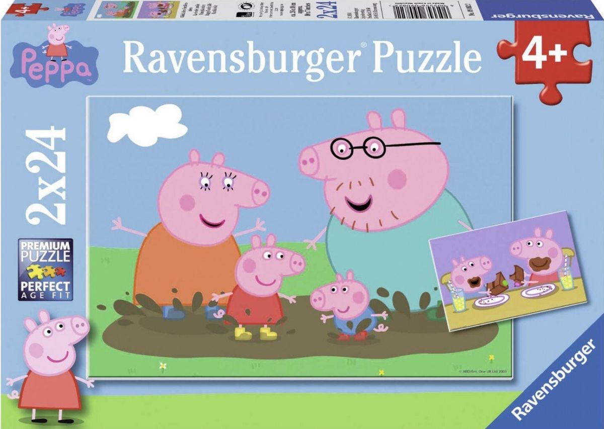 Puzzle 2x24 elementów Ravensburger składają się z 2 układanek po 24 elementy przedstawiających Świnkę Peppę bawiącą się w błocie. Zawartość i cechy zestawu: 2 obrazki przedstawiające motyw ze Świnką Peppą bawiącą się w błocie ilość elementów: 2 x 24 elementy wyraźne motywy na puzzlach, dzięki zastosowaniu struktury naturalnego lnu różnorodne kształty elementów, dzięki ręcznie wykonanej sztancy idealnie dopasowane puzzle do wieku dziecka części odporne na zginanie przeznaczony dla dzieci od 4. roku życia x