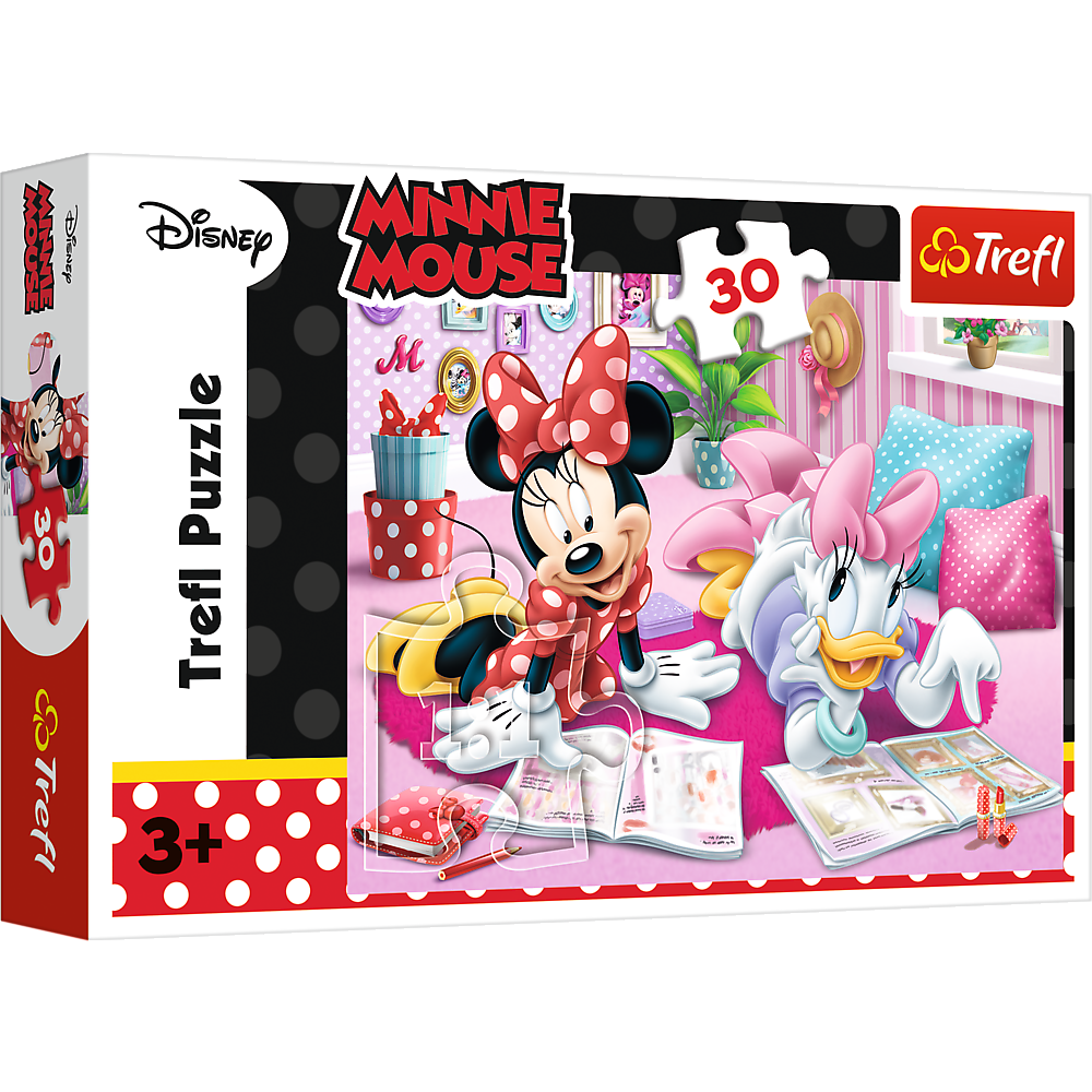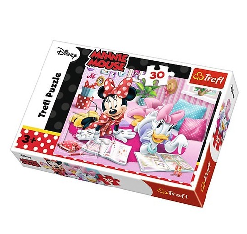 Puzzle 30 elementów z bohaterkami Minnie Mouse Disneya. Po ułożeniu powstanie obrazek o wymiarach 27x20 cm. Wysoką jakość, nasycenie kolorów i bezpieczeństwo układania zapewnia kalandrowany papier odbijający światło, pokryty ekologicznymi farbami spożywczymi. x