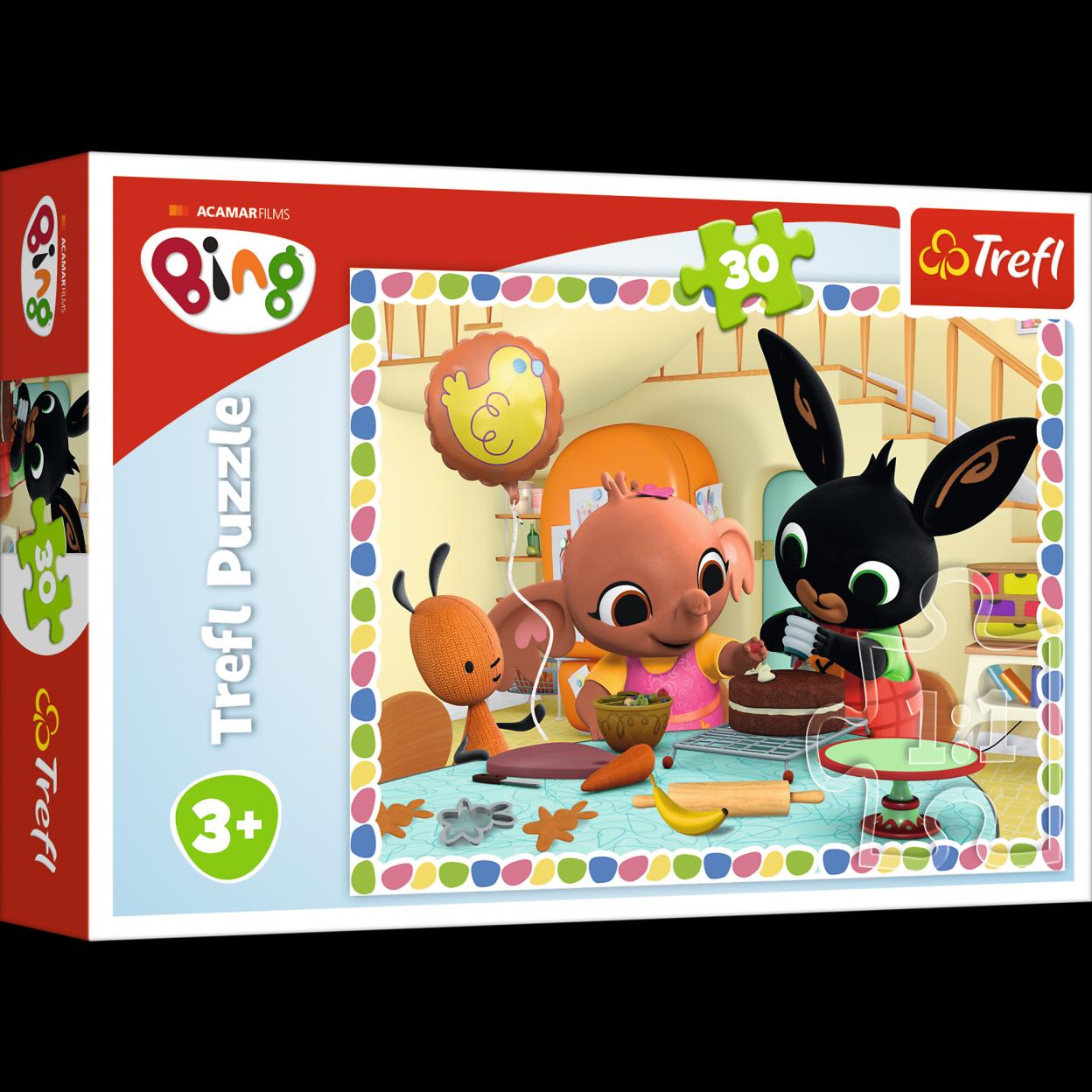 Opis produktuZasady bezpieczeństwaPuzzle 30 elementów z bohaterami filmu animowanego pt. "Bing". Po ułożeniu powstanie obrazek o wymiarach 200x270mm. Wysoką jakość, nasycenie kolorów i bezpieczeństwo układania zapewnia wykorzystanie materiałów ekologicznych. x