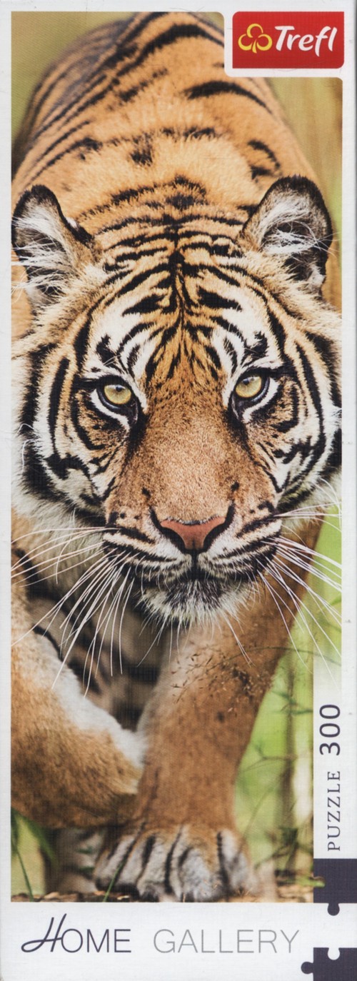Puzzle 300 elementów przedstawiające skradającego się tygrysa. Po ułożeniu powstanie obrazek o wymiarach 16x48 cm. Wysoką jakość, nasycenie kolorów i bezpieczeństwo układania zapewnia kalandrowany papier odbijający światło, pokryty ekologicznymi farbami spożywczymi.