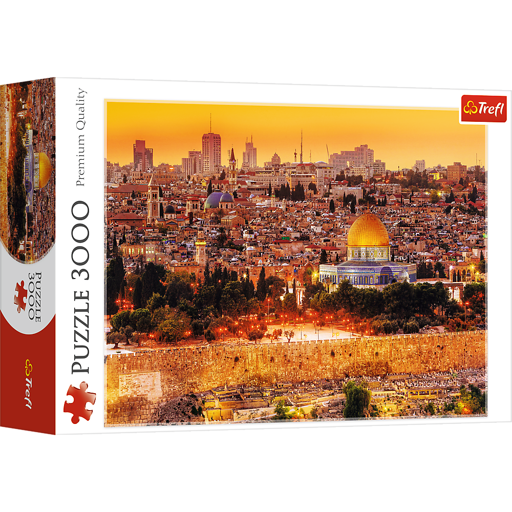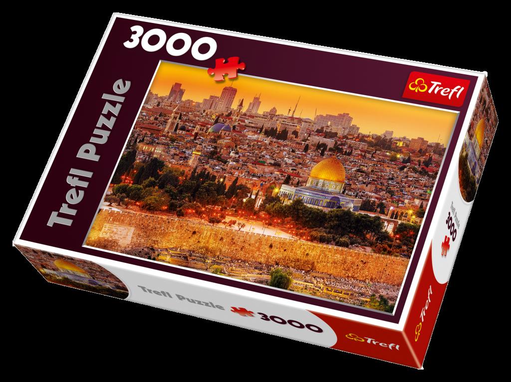 Puzzle 3000 elementów z widokiem na dachy Jerozolimy. Po ułozeniu powstanie obrazek o wymiarach 116x85cm. Wysoką jakość, nasycenie kolorów i bezpieczeństwo układania zapewnia wykorzystanie materiałów ekologicznych.