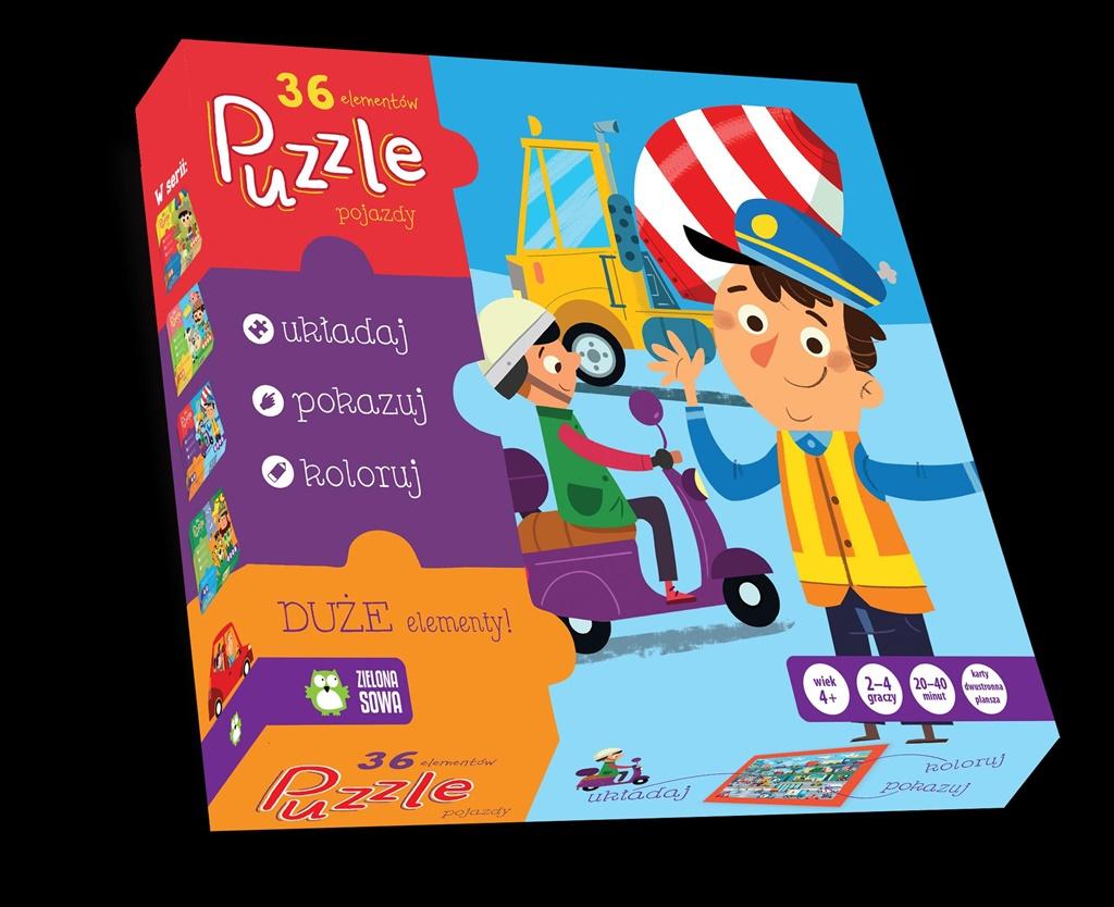 Seria puzzli wielkoelementowych z wyjątkowymi, kolorowymi ilustracjami. Dzięki dużym elementom i wygodnemu formatowi są idealne dla małych dzieci. Liczba puzzli i szczegółowość ilustracji są dostosowane do wieku dziecka: 2-latki układają obrazek składający się z 20 puzzli, a 4-latki z 36 elementów. Dodatkowo, puzzle zwierają ćwiczenie na spostrzegawczość – sprawdź, czy znajdziesz wszystkie wskazane elementy w specjalnej ramce? Po ułożeniu puzzli pokoloruj kolorowankę znajdującą się na odwrocie układanki. Udanej zabawy!