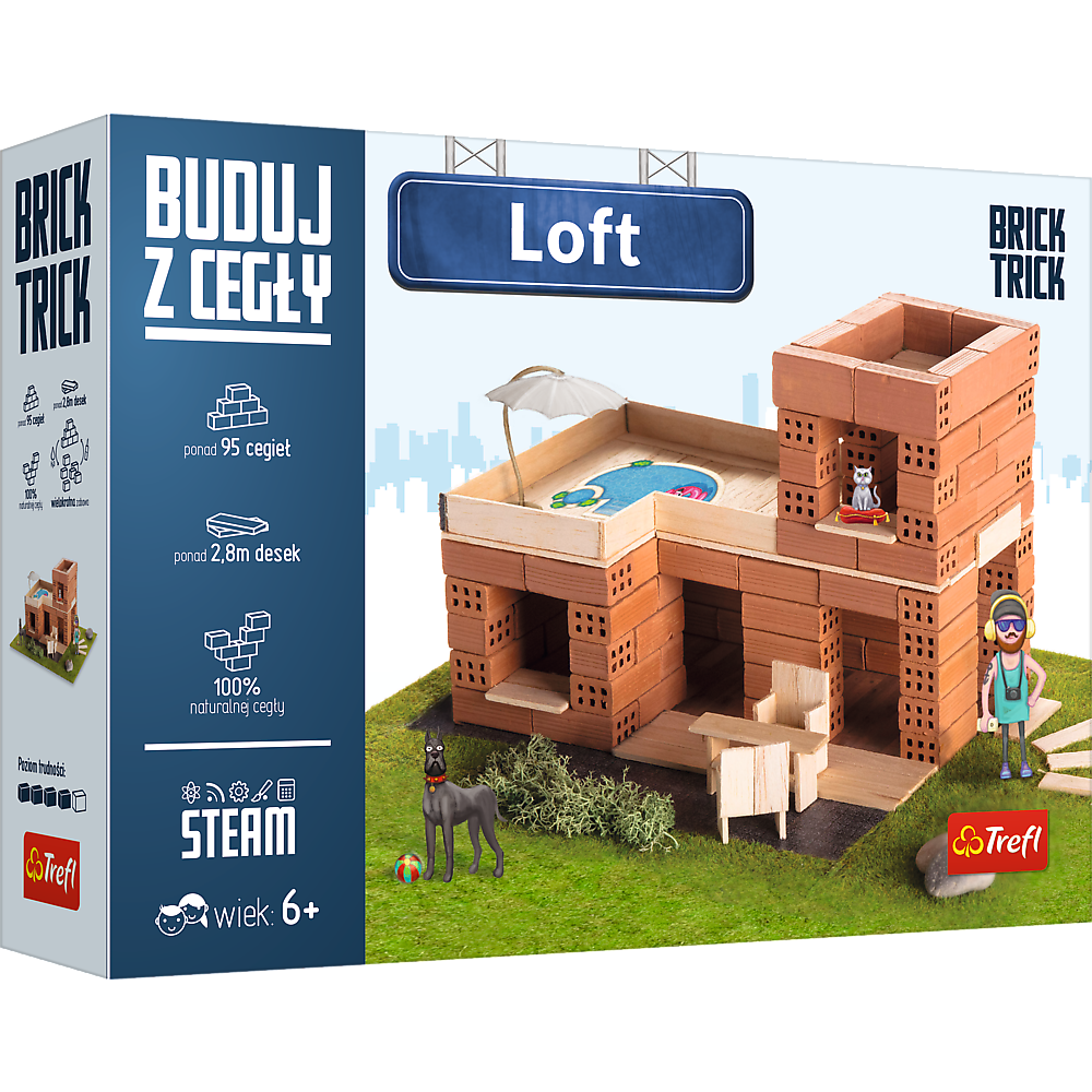 Wybuduj nowoczesny loft , wykorzystując prawdziwe cegły, drewno i elementy dekoracyjne jak trawa czy krzewy. Skorzystaj z dołączonych planów budowy lub użyj wyobraźni do stworzenia niepowtarzalnej konstrukcji. Baw się dołączonymi pionkami prosto z miejskiego świata! To nie koniec zabawy! Rozpuść konstrukcję w wodzie i buduj dalej wykorzystując ponownie te same cegły! W zestawie znajdziesz: prawdziwe cegły, klej, drewniane deseczki, elementy dekoracyjne, pionki, podstawkę, naklejkę i instrukcję!