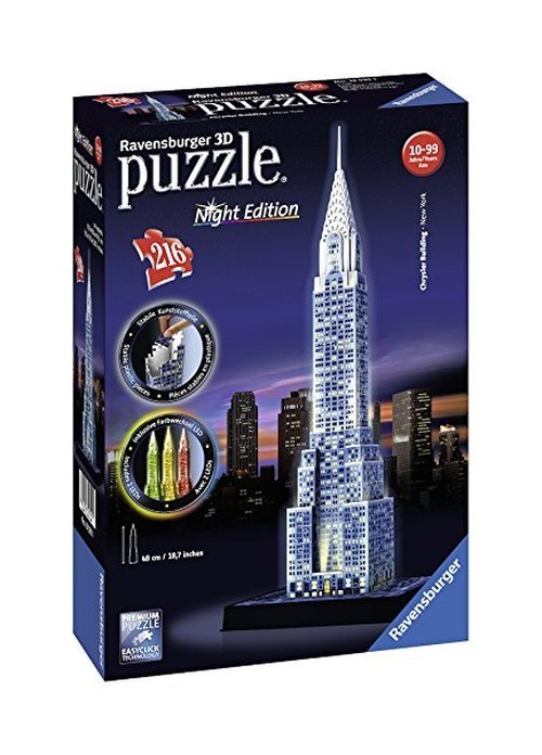 Stwórz fascynujący model Chysler Building Nocą ze stabilnych, plastikowych elementów puzzli i oświetl go od wewnątrz diodami LED. DO wyboru jest delikatne białe oświetlenie lub wariant barwny o zmieniających się odcieniach.