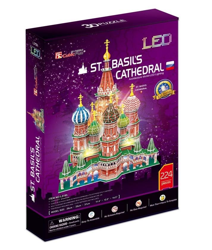 Puzzle 3D Katedry Świętego Bazyla w wersji zawierającej oświetlenie LED. W opakowaniu znajduje się 128 puzzli, wykonanych ze specjalnego materiału przypominającego piankę. Puzzle są ponumerowane, ponacinane i umieszczone na arkuszach. Wystarczy bez użycia siły wycisnąć element z arkusza i zmontować go zgodnie z dołączoną instrukcją, bez użycia kleju ani specjalnych narzędzi. Wielkość budowli po złożeniu to 48.7x 21.4 x 38 cm.