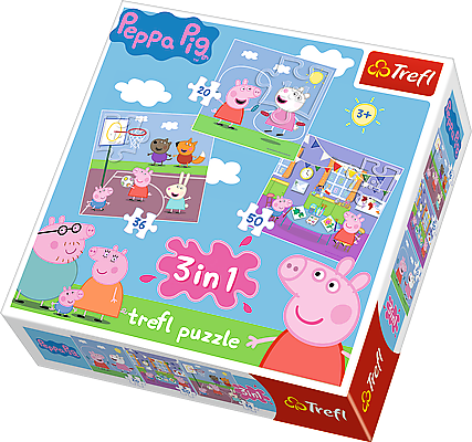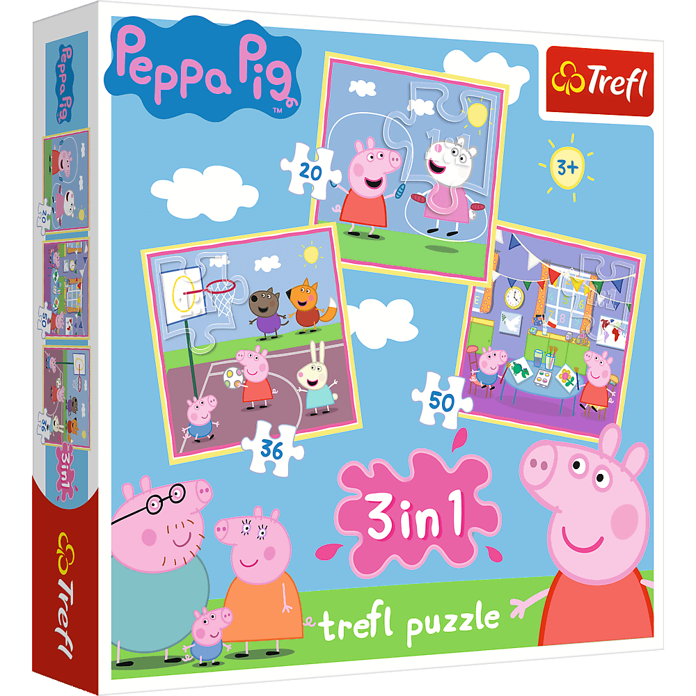 Zabawy w szkole - Puzzle 3w1Potrójna radość układania! Puzzle 3w1 ""Świnka Peppa"" to trzy układanki różnej wielkości z uwielbianą przez dzieci Peppą i jej rodziną. Zestaw doskonale spełnia oczekiwania rodzeństwa - każdy ułoży swój ulubiony obrazek nawet w tym samym czasie. Zróżnicowana liczba elementów pozwala na zabawę zarówno młodszym, jak i nieco starszym dzieciom. Dodatkowym urozmaiceniem zabawy może być układanie na czas, porównywanie obrazków, szukanie różnic i podobieństw. Piękna grafika puzzli ucieszy miłośników przyjaznej Peppy.Puzzle przyjazne dziecku!Do produkcji puzzli użyliśmy materiałów ekologicznych i płótnowanego papieru eliminującego odbijanie światła, co gwarantuje bezpieczeństwo i radość zabawy.