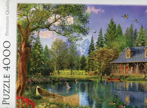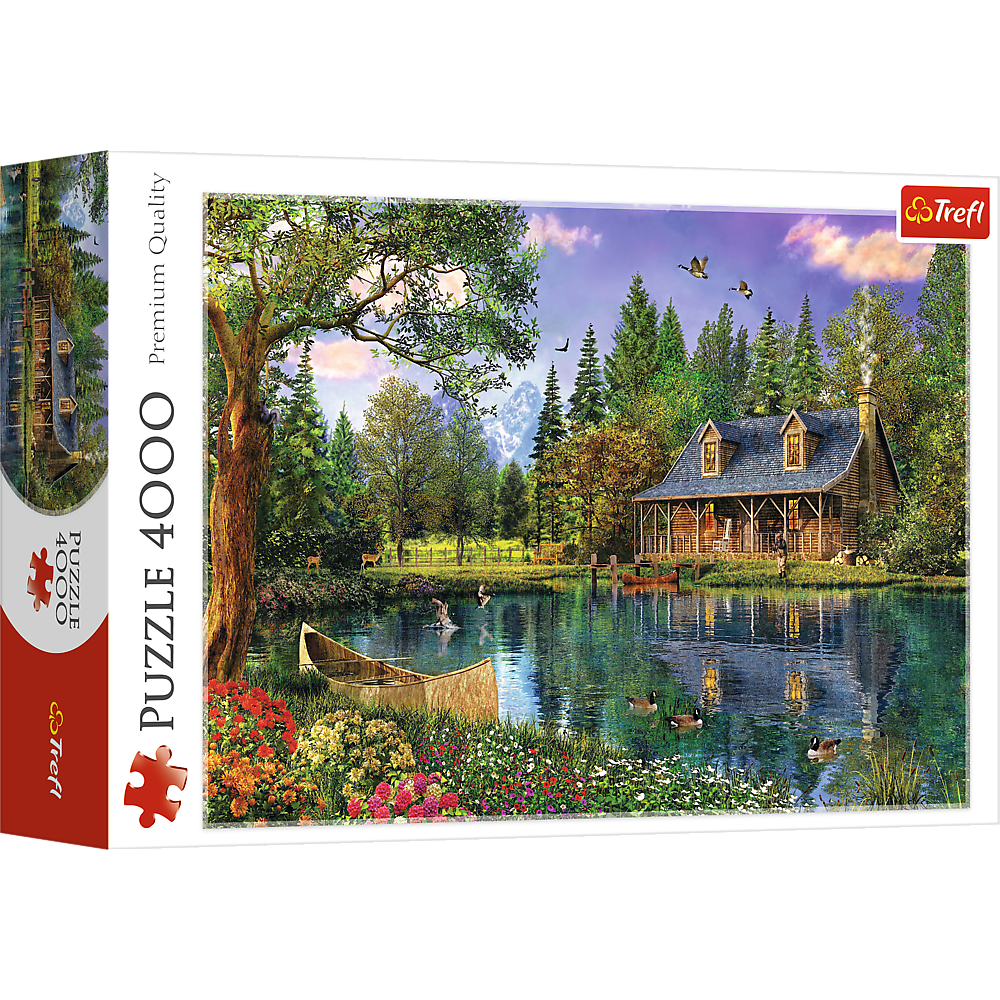 Puzzle 4000 elementów z obrazem przedstawiającym dom nad stawem. Po ułożeniu powstanie obrazek o wymiarach 136x96 cm. Wysoką jakość, nasycenie kolorów i bezpieczeństwo układania zapewnia kalandrowany papier odbijający światło, pokryty ekologicznymi farbami spożywczymi.