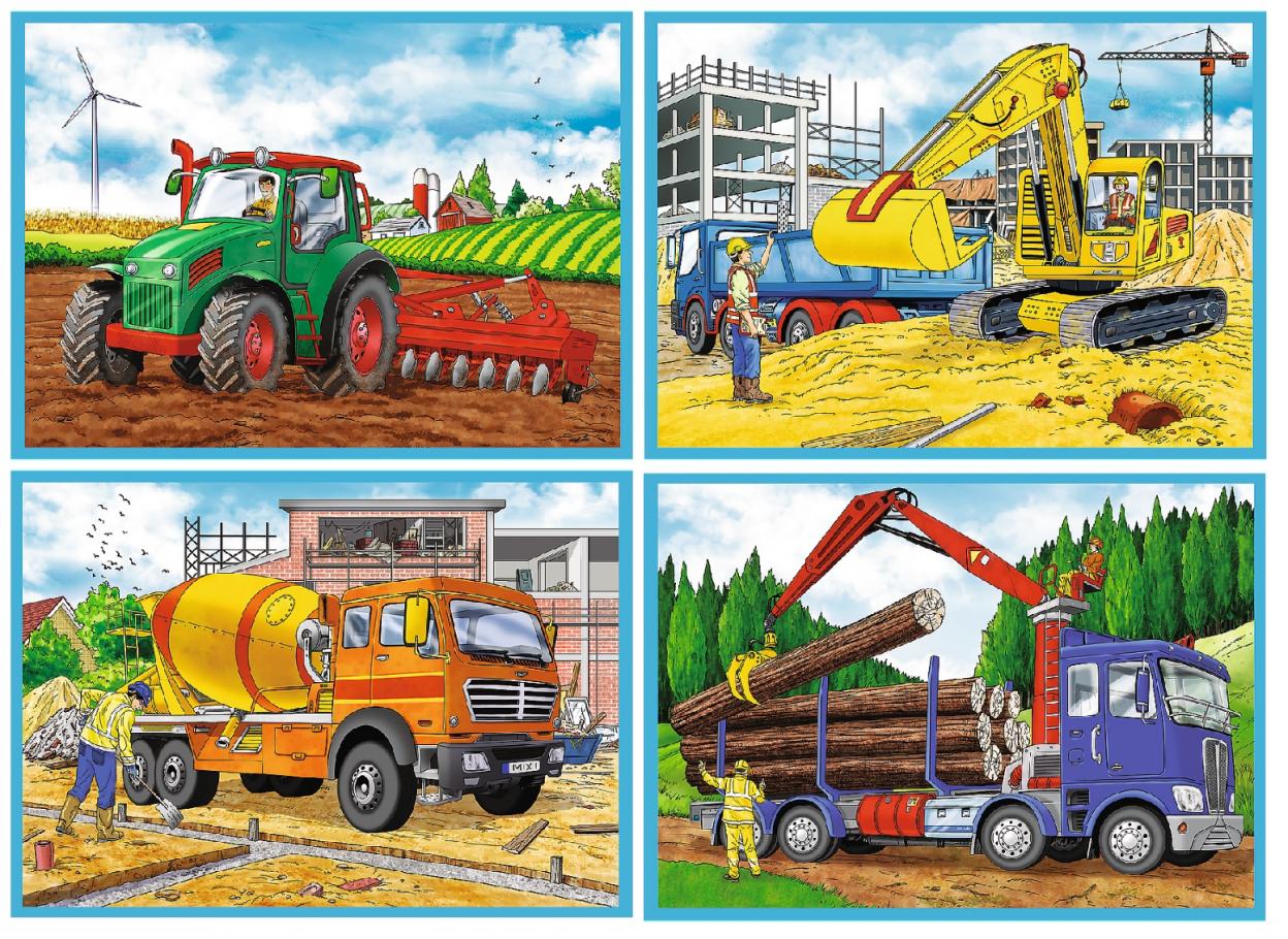 Puzzle wysokiej jakości, znanej i cenionej marki Trefl, cztery obrazki z maszynami budowlanymi.