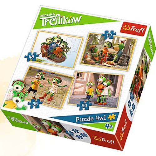 Nie jedna, nie dwie, ale aż cztery układanki zamknięte w jednym pudełku to prawdziwa gratka dla miłośników puzzli! Po ułożeniu otrzymamy cztery obrazki różnej wielkości z bohaterami serialu animowanego ""Rodzina Treflików"". Zestaw doskonale spełnia oczekiwania rodzeństwa - każdy ułoży swój ulubiony obrazek nawet w tym samym czasie. Zróżnicowana liczba elementów pozwala na zabawę zarówno młodszym, jak i nieco starszym dzieciom. Dodatkowym urozmaiceniem zabawy może być układanie na czas, porównywanie obrazków, szukanie różnic i podobieństw.