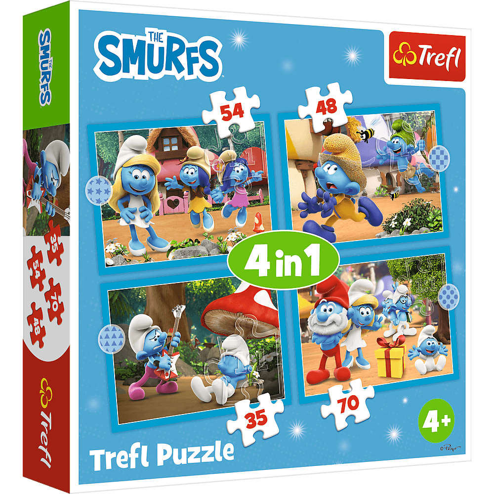 Wioska Smerfów to 4 niezależne układanki, zaprojektowane z myślą o małych fanach przygód bohaterów bajki Smerfy. Po ułożeniu puzzli powstaną 4 obrazki, z czego największy o wymiarach 285x205 mm. Zróżnicowana liczba elementów pozwala na zabawę zarówno młodszym, jak i nieco starszym dzieciom.