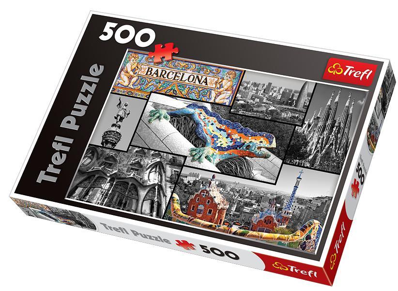 Puzzle - kolaż 500 elementów przypominające pocztówkę z Barcelony. Po ułożeniu powstanie obrazek o wymiarach 48x34cm. Wysoką jakość, nasycenie kolorów i bezpieczeństwo układania zapewnia wykorzystanie materiałów ekologicznych.