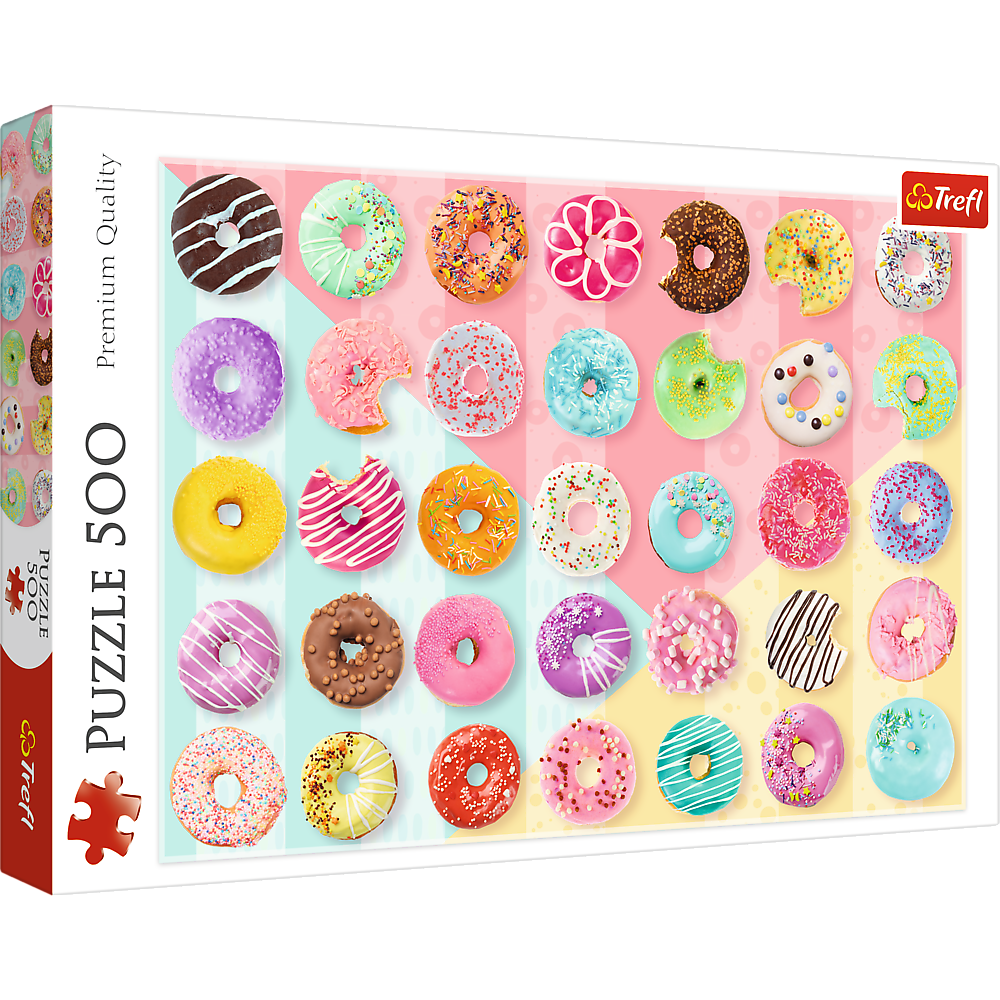 Puzzle 500 elementów przedstawiające kolorowe pączki. Po ułożeniu powstanie obrazek o wymiarach 48x34 cm. Wysoką jakość, nasycenie kolorów i bezpieczeństwo układania zapewnia kalandrowany papier odbijający światło, pokryty ekologicznymi farbami spożywczymi.