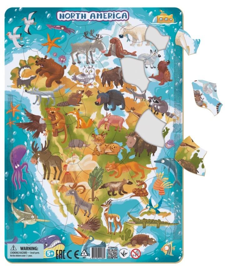 Opis produktuZasady bezpieczeństwaPuzzle DODO powstały specjalnie z myślą o najmłodszych. Mogą cieszyć się nimi zarówno kilkulatki, jak i kilkunastomiesięczne maluchy. Bogactwo wzorów i kolorów wprawia w zachwyt. Znajdziemy wśród nich motywy takie jak: zwierzęta, pory roku, droga mleczna itp., przygotowane w formie kolorowych ilustracji. Zestawy różnią się liczbą elementów oraz ich wielkością, co daje możliwość szerokiego wyboru zgodnie z wiekiem dziecka. Puzzle ramkowe 53 elementy - to doskonałe połączenie zabawy z edukacją. Układanie ich jest niezwykłe! Puzzle mają nieregularny kształt, dzięki czemu dziecko ćwiczy nie tylko koncentrację, ale także trenuje swój mózg. Tematyka obrazków jest bogata w informacje, które w przyjazny i miły sposób przyswajają dzieci. Na planszy znajduje się obrys elementów, który ułatwia ich ułożenie. W serii znajdują się puzzle o tematyce: kontynentów na których zamieszkują różne zwierzęta, (Australia, Ameryka Południowa, Ameryka Północna, Antarktyda, Afryka, Euroazja) oraz serie puzzli zwierząt (koty, psy i dinozaury). W tym zestawie poznasz kształt Ameryki Północnej oraz zwierząt, które zamieszkującą ten kontynent. Wiek: 5+ x