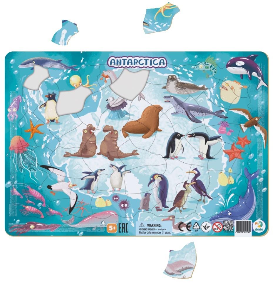 Opis produktuZasady bezpieczeństwaPuzzle DODO powstały specjalnie z myślą o najmłodszych. Mogą cieszyć się nimi zarówno kilkulatki, jak i kilkunastomiesięczne maluchy. Bogactwo wzorów i kolorów wprawia w zachwyt. Znajdziemy wśród nich motywy takie jak: zwierzęta, pory roku, droga mleczna itp., przygotowane w formie kolorowych ilustracji. Zestawy różnią się liczbą elementów oraz ich wielkością, co daje możliwość szerokiego wyboru zgodnie z wiekiem dziecka. Puzzle ramkowe 53 elementy - to doskonałe połączenie zabawy z edukacją. Układanie ich jest niezwykłe! Puzzle mają nieregularny kształt, dzięki czemu dziecko ćwiczy nie tylko koncentrację, ale także trenuje swój mózg. Tematyka obrazków jest bogata w informacje, które w przyjazny i miły sposób przyswajają dzieci. Na planszy znajduje się obrys elementów, który ułatwia ich ułożenie. W serii znajdują się puzzle o tematyce: kontynentów na których zamieszkują różne zwierzęta, (Australia, Ameryka Południowa, Ameryka Północna, Antarktyda, Afryka, Euroazja) oraz serie puzzli zwierząt (koty, psy i dinozaury). W tym zestawie poznasz kształt Antarktydy oraz zwierząt, które zamieszkującą ten kontynent. Wiek: 5+ x