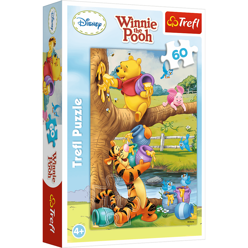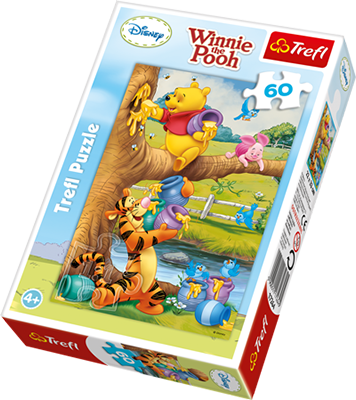 Puzzle 60 elementów z ulubieńcami dzieci: Kubusiem Puchatkiem, Tygryskiem i Prosiaczkiem. Po ułożeniu powstanie obrazek o wymiarach 22x33 cm. Wysoką jakość, nasycenie kolorów i bezpieczeństwo układania zapewnia kalandrowany papier odbijający światło, pokryty ekologicznymi farbami spożywczymi.