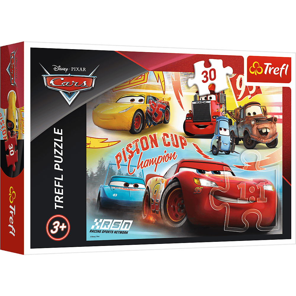 Puzzle 30 elementów z bohaterami filmu animowanego "Auta". Po ułożeniu powstanie obrazek o wymiarach 27x20cm. Wysoką jakość, nasycenie kolorów i bezpieczeństwo układania zapewnia kalandrowany papier odbijający światło i wykorzystanie materiałów ekologicznych.