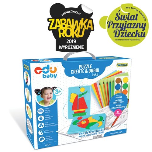 ? 2 zestawy edukacyjnych puzzli tematycznych Create&Draw Lake, z których można ułożyć dwa obrazki: ŻAGLÓWKĘ I RYBĘ