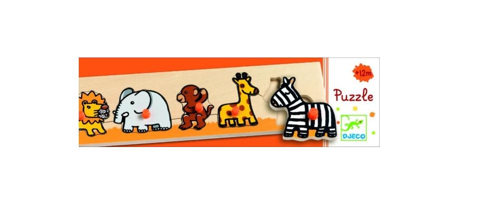 Drewniane puzzle Safari to drewniane puzzle kształtowe dla najmłodszych dzieci. Zadaniem dziecka jest dopasowanie danego zwierzątka do właściwego kształtu. Uchwyty na każdym klocku sprawiają, ze małym rączkom niezwykle łatwo je chwycić. W skład puzzli wchodzi 5 zwierząt: lew, słoń, małpka, żyrafa i zebra. Ta wesoła ferajna pomoże twojemu dziecku poznać nazwy zwierząt oraz rozwinie zręczność paluszków. Fantastyczna zabawka edukacyjna. Wymiary: 29,5x7,8x1 cm Wiek dziecka : 1+