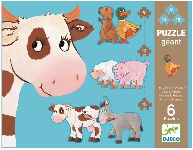 Puzzle Gigant Zwierzęta na Farmie to puzzle specjalnie zaprojektowane z myślą o najmłodszych dzieciach - już od drugiego roku życia. Duże klocki mogą być bez trudu układane przez małe rączki.Walory edukacyjne:ćwiczenie spostrzegawczości,koncentracji,rozwój wyobraźni Zestaw zawiera 6 układanek o różnym stopniu trudności,które po ułożeniu jeden na drugim utworzą ponad metrową wieżę kaczka i piesek - puzzle 9 elementów świnka i owieczka - 12 elementów krówka i osiołek - 15 elementów Przyjemna nauka poznawania mieszkańców farmy! Wiek dziecka : 3 lata + Wielkość opakowania : 33 x 25,5 x 6 cm