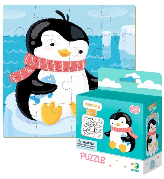 To dwustronna zabawa. Na jednej stronie znajduje się zwierzęcy obrazek (16 elementów), na drugiej zaś znajdziemy ten sam wzór w formie kolorowanki, którą maluch śmiało może pokolorować według własnego uznania. W tym zestawie na obrazku znajdziemy sympatycznego Pingwinka. Wiek: 3+ m+, Ilość elementów: 16. W serii DODO Puzzle + kolorowanka można odkryć 4 zestawy o różnej tematyce: Jeżyk, Misiu, Pingwinek i Zajączek x