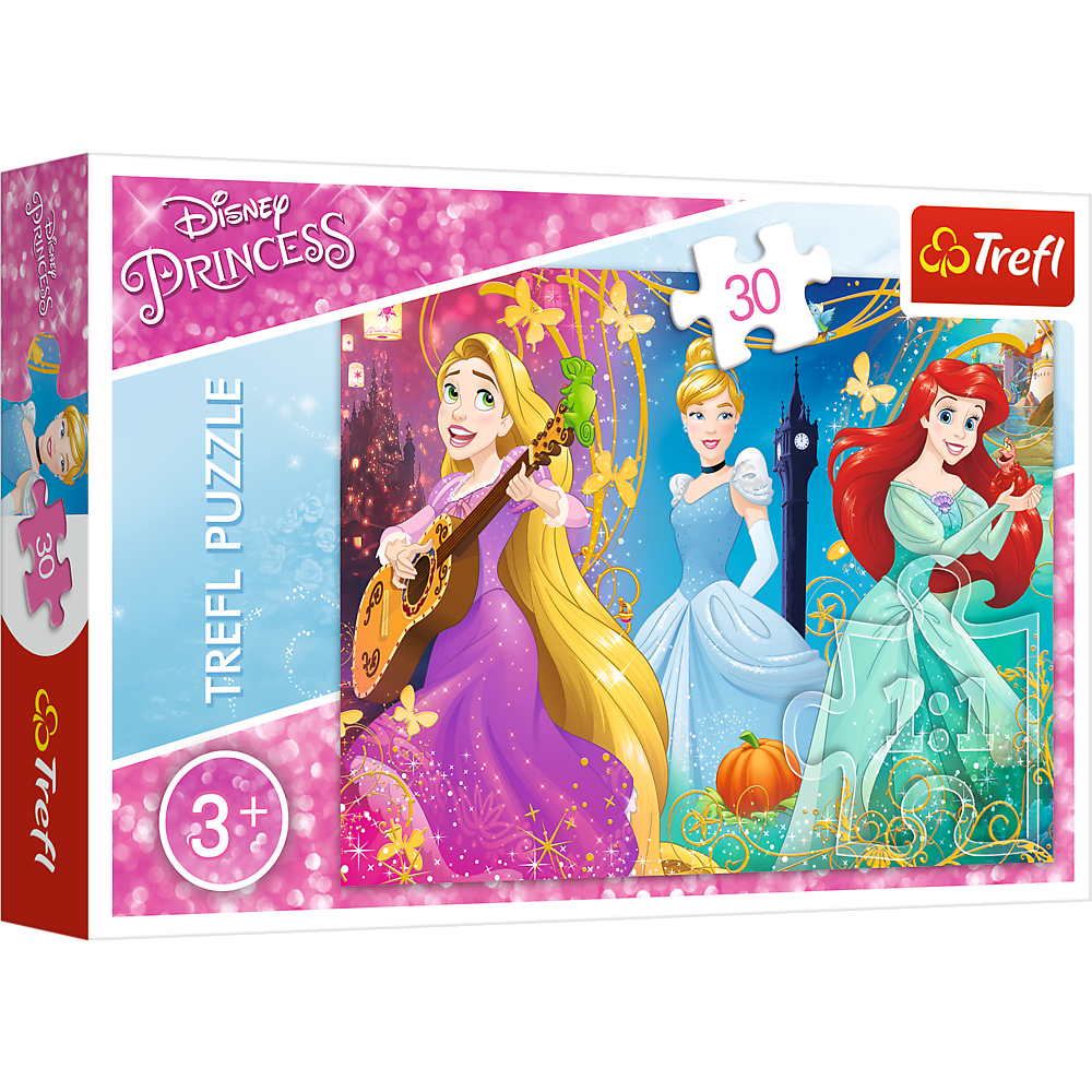 Puzzle 30 elementów z księżniczkami Disneya. Po ułożeniu powstanie obrazek o wymiarach 27x20 cm. Wysoką jakość, nasycenie kolorów i bezpieczeństwo układania zapewnia kalandrowany papier odbijający światło, pokryty ekologicznymi farbami spożywczymi.