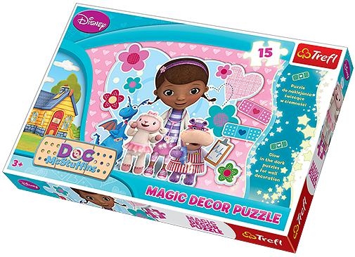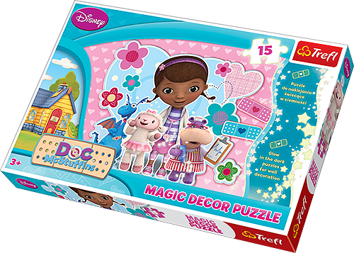 Klinika dla pluszaków - Puzzle Magic DecorMAGIC DECOR to duże, świecące w ciemności puzzle, którymi można również ozdobić pokój dziecka! Zastosowanie specjalnej techniki, sprawia, że układanka wystawiona na promienie słoneczne lub sztuczne światło będzie świeciła w ciemności! Po ułożeniu powstanie obrazek o wymiarach 60x40 cm przedstawiający doktor Dosię i jej przyjaciół z kliniki dla pluszaków.W skład produktu wchodzą: puzzle 15-elementowe, ramka pocięta na puzzle z dodatkowymi wyciskanymi elementami do zakomponowania.