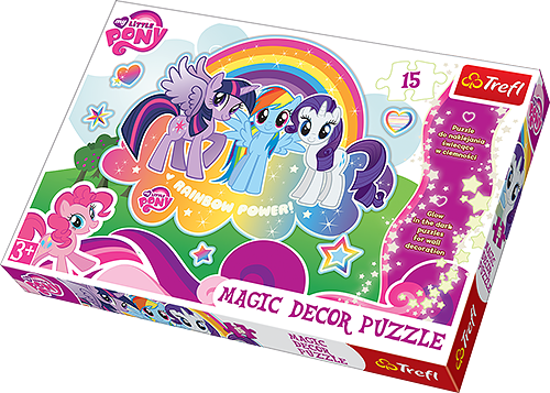 Kucyki - Puzzle Magic DecorMAGIC DECOR to duże, świecące w ciemności puzzle, którymi można również ozdobić pokój dziecka! Zastosowanie specjalnej techniki, sprawia, że układanka wystawiona na promienie słoneczne lub sztuczne światło będzie świeciła w ciemności! Po ułożeniu powstanie obrazek o wymiarach 60x40 cm przedstawiający radosne kucyki.W skład produktu wchodzą: puzzle 15-elementowe, ramka pocięta na puzzle z dodatkowymi wyciskanymi elementami do zakomponowania.