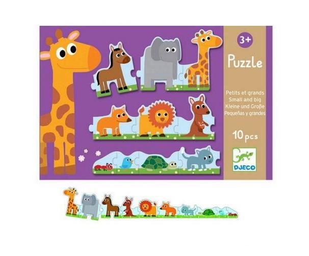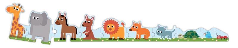 Tekturowe puzzle dla małych dzieci.Zwierzątka ( 10 sztuk ) należy poukładac od najmniejszego do największego jeden za drugim .Walory edukacyjne:nauka o otaczjacym świecie,ćwiczenie wyobraźni,koncentarcj,małej motoryki dłoni.Wiek :3 lata +.Wielkość opakowania:18 x 12 x 6 cm