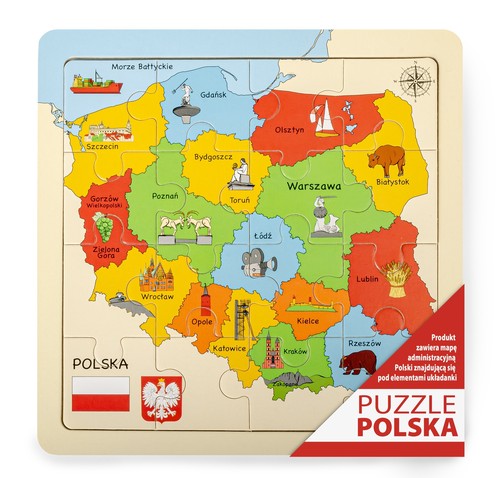 Edukacyjna drewniana układanka rozwijająca zdolności manualne jednocześnie przekazując ciekawe informacje na temat charakterystycznych elementów związanych z różnymi regionami Polski. Puzzle POLSKA, przestawiają województwa z ich popularnymi symbolami. Pod wierzchnią warstwą puzzli znajdziemy mapę administracyjną Polski z podziałem na powiaty.