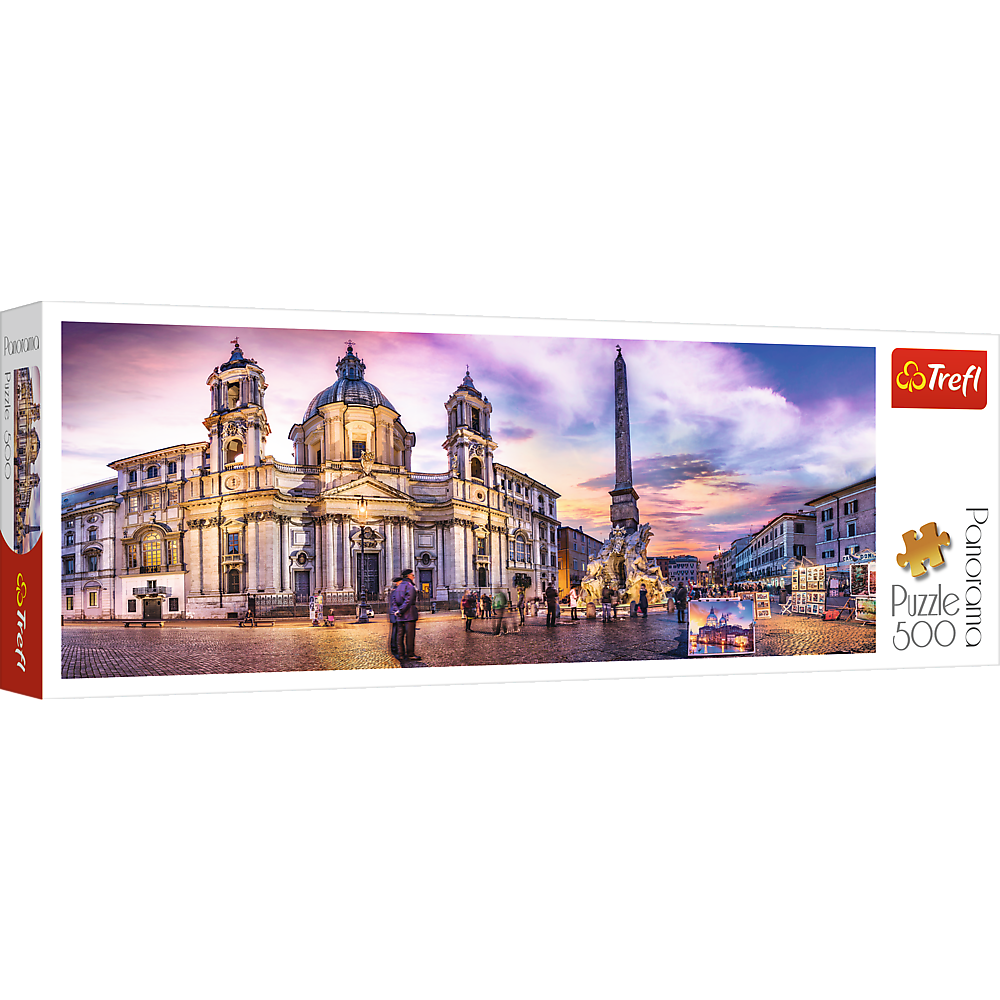 Opis produktuZasady bezpieczeństwaPuzzle panoramiczne składające się z 500 elementów przedstawiające Piazza Navona w Rzymie. Po ułożeniu powstanie obrazek o wymiarach 660 x 237mm. Produkt został wykonany z wysokiej jakości materiałów, z zastosowaniem specjalnego kalandrowanego papieru odbijającego światło, co ułatwia układanie. Produkt został wyprodukowany w Polsce, a do produkcji zostały użyte materiały ekologiczne. x