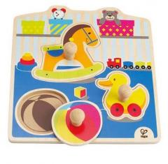 Kolorowe, wykonane z drewna puzzle pomagają poznawać ulubione zabawki i ich kształty poprzez dopasowywanie. W zestawie znajdują się 4 elementy.