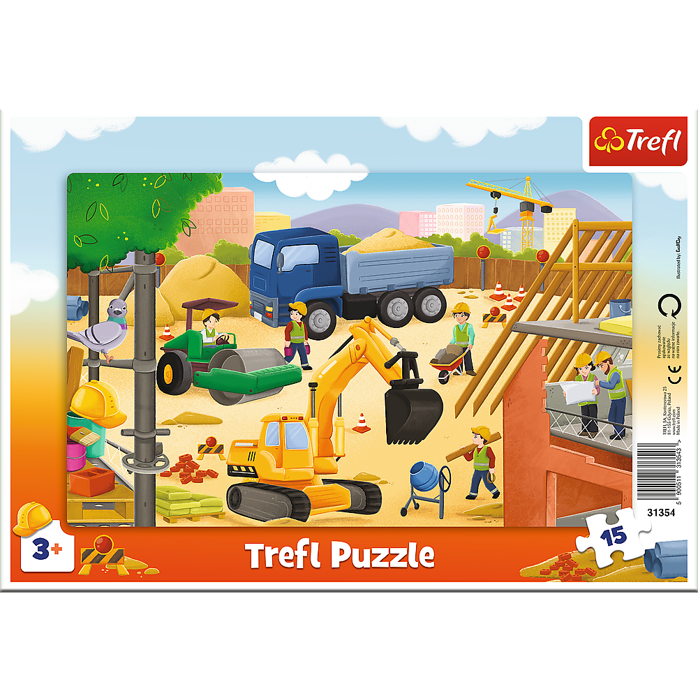 olorowe scenki z placu budowy z pewnością zachęcą dzieci do układania. Dodatkowo rozwiną u nich takie umiejętności, jak: liczenie, rozpoznawanie kolorów, umiejętność kojarzenia, spostrzegawczość i dostarczą wiedzy o otaczającym je świecie. Układanka zawiera 15 elementów umieszczonych w ozdobnej, spójnej graficznie ramce, tworzącej z obrazkiem bardzo ładną całość.