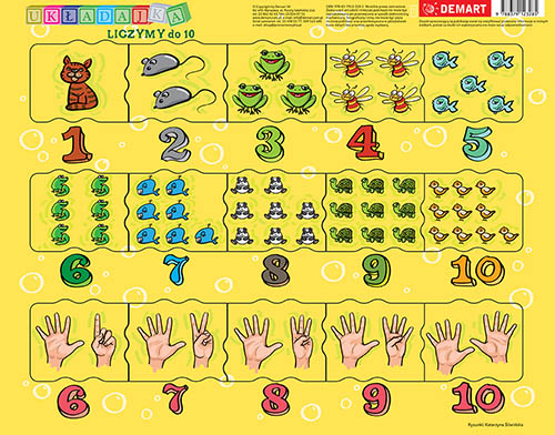 UKŁADAJKA, czyli poznawanie liczb do 10 dla najmłodszych (4–6 lat)! Z 15 ruchomymi elementami o indywidualnym niepowtarzalnym kształcie wykrojonymi w odpowiednich miejscach obrazka. W Układajce dziecko ma odnaleźć i dopasować 15 wyjmowanych elementów tworzących logiczną całość z podpisanymi liczbami od 1 do 10. Na wyjmowanych elementach są narysowane albo różne zwierzęta ilustrujące liczy od 1 do 10 albo pokazane dłonie z wyprostowanymi palcami w liczbie od 6 do 10. Podwójne zilustrowanie liczb 6-10 ma na celu uzmysłowienie dziecku ich wartości i znaczenia porządkowego (pięć palców to mniej niż sześć, a dziesięć to więcej niż 8 i 9 co łatwo sprawdzić na własnych dłoniach). Ćwiczenia w tym zakresie od 1 do 5 dziecko może spróbować wykonać samo. Ułatwieniem w dopasowaniu zwierząt do liczb jest kolorystyka. Każda podpisana liczba i zwierzęta mają ten sam kolor przewodni (np. 4 – czerwony a 7 – niebieski). Zresztą każdy wyjmowany element ma niepowtarzalny kształt, który trzeba umiejętnie i precyzyjnie umieścić. Przy dopasowywaniu elementów z dłońmi dziecko powinno zwracać uwagę na liczbę wyprostowanych palców co wymaga skupienia i koncentracji. Musi opracować swoją strategię w zapełnianiu puzzlowego obrazka. Układajka ćwiczy więc logiczne myślenie i koncentrację, spostrzegawczość i precyzję ruchów. Zabawę można podzielić na kilka podejść gdy dziecko się nią znuży. W zestawie jest wzór do układania. Podczas zabawy z układajką można odciągnąć dziecko od zabawy z telefonem czy tabletem!