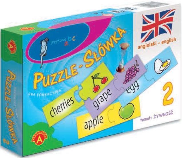 ,,Puzzle-Słówka"", to gra i zabawka dla dzieci, któreumieją już czytać i można je zachęcić do nauki językaangielskiego. Zabawka zawiera 30 dwuczęściowychelementów. Na jednej części znajduje się obrazek, a nadrugiej jego angielska nazwa. Znajdowanie i łączeniepasujących do siebie par puzzli, umożliwiaindywidualną zabawę, w której dziecko może poznaćpierwsze angielskie słowa.
