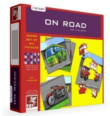 Zestaw składa się z 6 obrazków puzzli przedstawiających pojazdy. Obrazki mają 4 do 6 elementów. Każdy obrazek posiada odpowiadającą mu kształtem i wymiarami ramkę, w której powinien być ułożony.