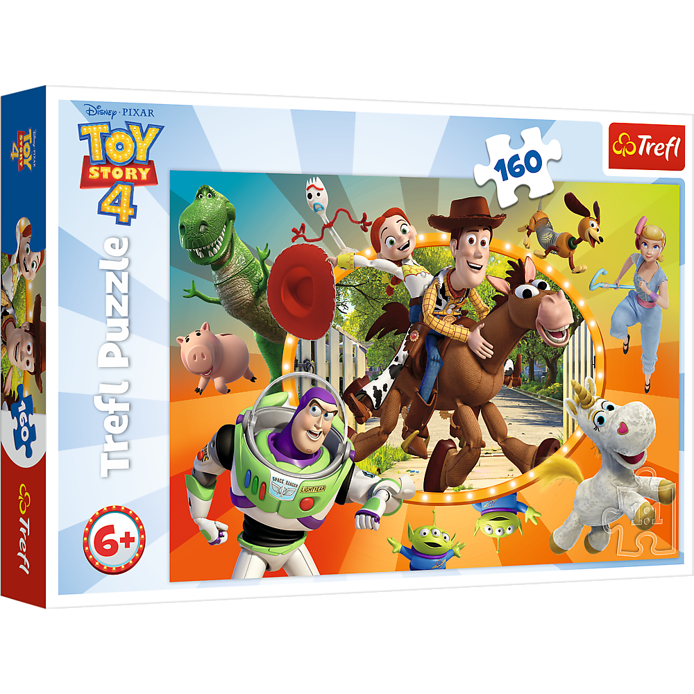 Puzzle 160 elementów z bohaterami bajki Toy Story. Po ułożeniu powstanie obrazek o wymiarach 41x27,8cm. Wysoką jakość, nasycenie kolorów i bezpieczeństwo układania zapewnia kalandrowany papier odbijający światło i wykorzystanie materiałów ekologicznych.