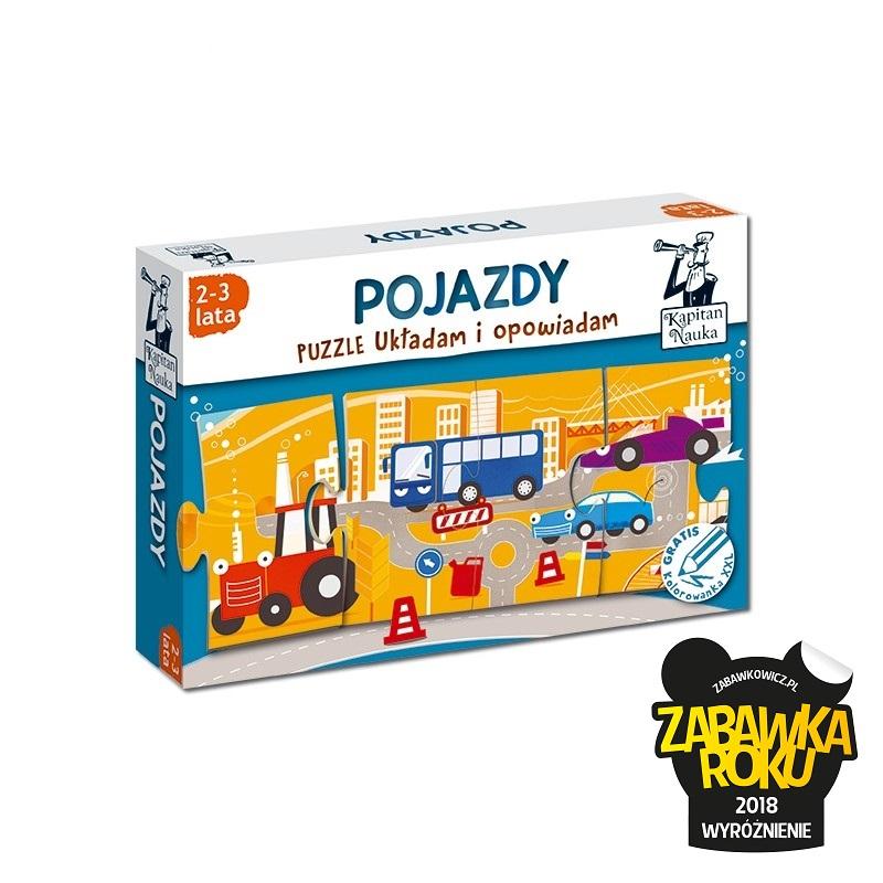 Pojazdy to wyjątkowa, dłuuuga układanka przygotowana z myślą o najmłodszych dzieciach. Duże, trwałe, wykonane z grubej tektury elementy z łatwością dopasuje do siebie nawet dwulatek. Dzięki dużemu formatowi 10-częściowych puzzli zabawa dostarczy dzieciom wiele radości, ćwicząc przy tym motorykę małą, umiejętność rozpoznawania kształtów i dopasowywania elementów.